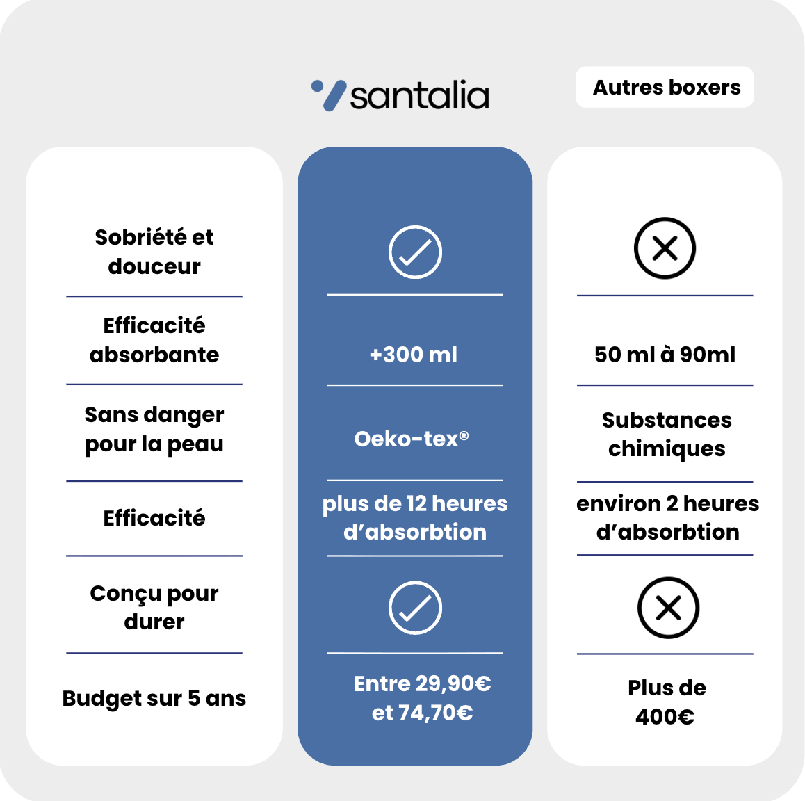 Chaque boxer Santalia intègre une protection ultra-absorbante conçue pour stopper les fuites dès qu’elles apparaissent.